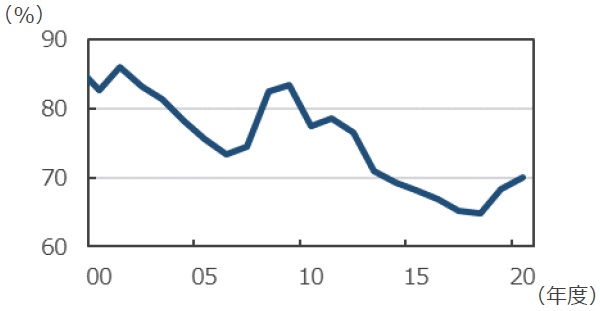 ■こうした日本企業の体質は、大きく変わりつつあります。昨今のガバナンス意識の高まりもあり、日本企業は選択と集中を進め、ROEを意識し、固定費の引き下げを図ってきました。こうした取り組みが奏功し、かつて85%を超えていた日本の大企業(資本金10億円以上、除く金融保険業)の損益分岐点売上高比率は60%台まで低下(2020年度はコロナ禍で上昇)し、予想利益ベースのROEも9%を超える水準まで上昇しています。
