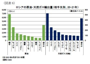以上、ロシア経済の鈍化による他国・地域への影響を見てきた。図表5からは影響度は欧州や韓国、中国で大きいことが分かる。端的にはこれらの国がロシアからエネルギー供給を大きく受けていることを反映している(図表6)。