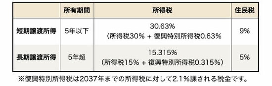 譲渡した年の1月1日において所有期間が5年を超えるものを「長期譲渡所得」、5年以下のものを「短期譲渡所得」といいます。それぞれの税率は上の表をご確認ください。