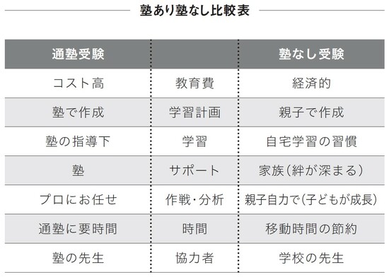 また、我が子の進路を塾任せ=人任せにしないということは、自分たちの責任のもとで受験し、万が一希望通りにいかなかった場合も、他人のせいにはできません。親として責任も大きくなります。「受験は失敗できない」のは、塾あり・塾なしも同じですが、塾なしの場合は、親子で頑張った結果をしっかり受け止めなければなりません。