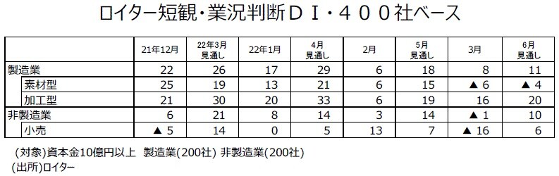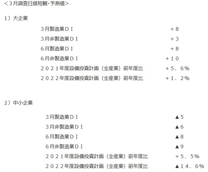 ●また、大企業・非製造業の業況判断DIは+3程度と、こちらは12月調査の+9から6ポイント程度低下するとみた。まん延防止等重点措置発令の影響が出るとみた。