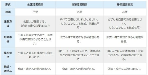 普通方式の遺言書は「公正証書遺言」、「自筆証書遺言」、「秘密証書遺言」に区分され、下の表に示すようにそれぞれ特徴が異なります。これらのうち「自筆証書遺言」と「秘密証書遺言」は検認が必要です。