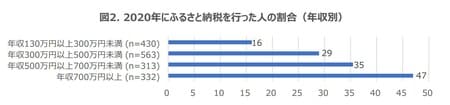 また、図2は、ふるさと納税を行った人の割合を年収別に示したものである。図2からは、年収の高い人ほど、ふるさと納税を行った人の割合は大きい傾向が確認できる。実質2000円の負担で寄付することができる金額の上限は、所得が高い人ほど高いため、ふるさと納税は所得が高い人ほどメリットが大きい制度であることを反映していると考えられる。