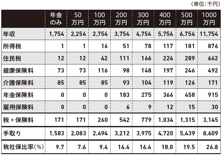 図表2は、年金が4割減になる将来ではなく、現行の厚生年金給付を前提に、年金をもらいながら給与収入を増やしていったときの負担のシミュレーションだ。