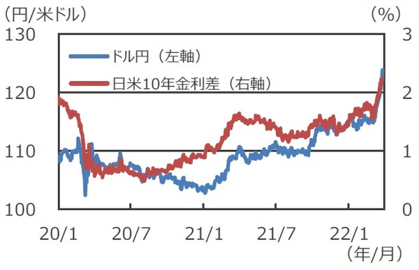 ■足元の急激なドル高・円安は、やや行き過ぎ感が強く、いったん調整も見込まれます。しかしながら、米国では今年金融政策の引き締めが進むとみられる一方、日本では当面金融緩和が維持されるとの見方から、日米で金融政策の方向性が異なる見通しです。日本の貿易赤字が定着しつつあることを踏まえると、中長期的には需給面で円売り圧力が強まることも想定され、円安地合いが続く可能性があります。