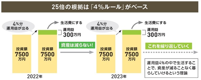これは、資産を年4%で運用し、かつ生活費も4%以内に収めれば資産が減らない「4%ルール」をベースとしたアメリカ発の計算方法です。