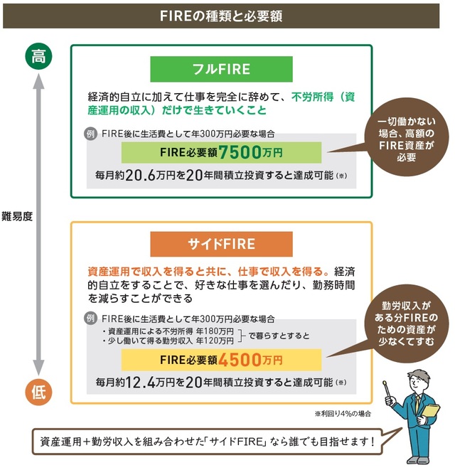 サイドFIREでは、不労所得と生活費の差額分を勤労収入で補います。FIRE用資産の目標額を自分で自由に設定できるため、普通の会社員でも、ぐっと手が届きやすくなるのです。