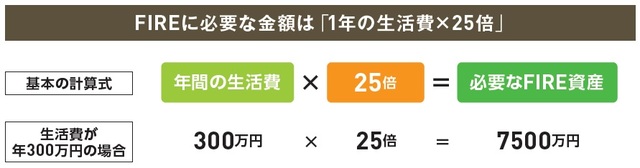 FIREに必要な金額は、「年間の生活費×25倍」で計算します。たとえば、年間300万円(月平均25万円)の生活費がかかる場合、FIREするために7500万円の投資額が必要となります。