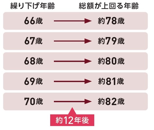 年金を繰り下げる場合には、損益分岐点に注意。70歳まで受給開始を繰り下げた場合は、損益分岐年齢が81歳10ヵ月。それ以前に亡くなってしまうと、65歳から受給した場合よりも受給総額が少なくなります。