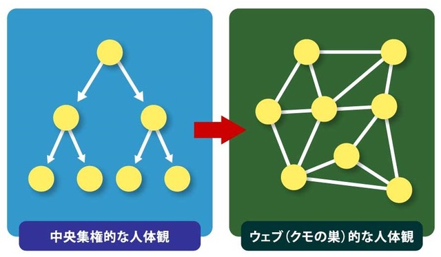 「脳が全身を支配する」という人体観から、「人体は巨大なネットワークである」というまったく新しい人体観に変わったと言うことができるでしょう【図表】。この転換は、医学の在り方自体にも大きな影響を与えずにはいません。