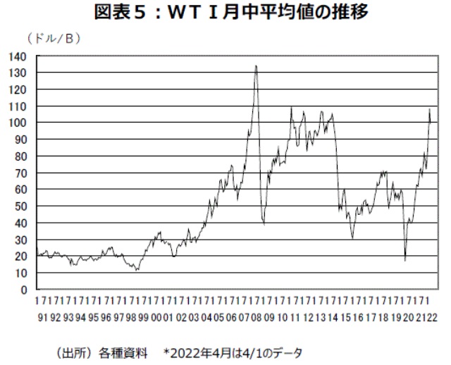 ロシアによるウクライナへの軍事侵攻の影響でエネルギー価格や穀物価格が高騰している。両国が主要輸出国だからだ。原油価格は3月1日のWTIが1バレル=103.41ドルと2014年7月以来7年8ヵ月ぶりの水準に上昇した。3月8日にはWTIが一時1バレル=130ドル台と2008年7月以来約13年8ヵ月ぶりの高値を付け、終値も1バレル=123.70ドルであった。その後はやや落ち着いた動きになり4月1日の終値は1バレル=99.27ドルになった(図表5)。