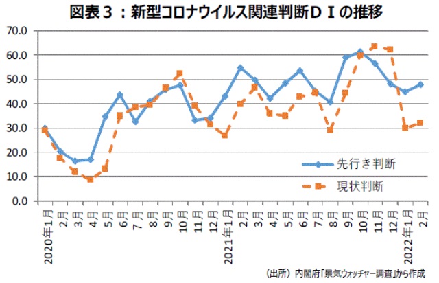 景気ウォッチャー調査の現状判断DIは21年12月では57.5と過去2番目の高水準であったが、22年2月は37.7へ低下した。21年~22年2月の14ヵ月で、緊急事態宣言またはまん延防止等重点措置発令月の平均39.8、非発令月・平均54.5となっている。2月が低水準になったのは、まん延防止等重点措置が発令された影響が大きいが、2月25日~28日が調査期間なのでウクライナ情勢も影響したとみられる。新型コロナウイルス関連現状判断DIは、20年1月以来最高水準になった21年11月が63.3で最高だが、新型コロナウイルス第6波の影響から22年1月には29.8へと急落し、2月は31.9となった(図表3)。
