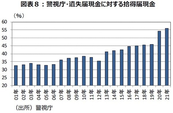 警視庁の遺失届現金に対する拾得届現金の比率は21年も改善傾向となった。遺失届現金の前年比は▲1.3%とコロナ禍でもあり2年連続の減少になったが、拾得届現金の前年比は+2.1%と2年ぶりの増加になった。遺失届現金に対する拾得届現金比率は12年の35.4%をボトムに9年連続上昇、21年は56.0%と20年54.2%をさらに上回った(図表8)。現金を紛失しても6割近く戻ってくるという社会の安定を示唆していよう。