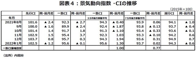 但し、景気動向指数の最近の一致CIを使った景気の基調判断をみると、21年3月分~8月分では「改善を示している」であったが、21年9月分~22年1月分では「足踏みを示している」の判断が継続している。鉱工業生産指数が「持ち直し」なのに、景気動向指数が「足踏み」では判断が違うようにみられる。しかし、両者の差は紙一重である。景気動向指数は1月改定値で前月差が速報値の▲0.5から▲0.1に上方修正された(図表4)。もし、改定値があと0.2ポイント大きく上方修正され+0.1になっていたら、一致CIの1月分の3ヵ月後方移動平均・前月差は3ヵ月連続の上昇、かつ一致CIの前月差が上昇になり、「改善」に戻る条件を満たしたのである。