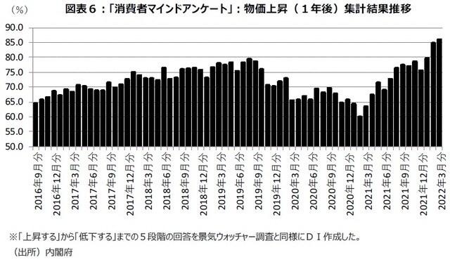 内閣府の「消費者マインドアンケート調査」の物価見通し(5段階評価)から景気ウォッチャー調査流のDIを作成すると、直近22年3月調査で16年9月の統計開始以来の最高水準を2月調査に続き更新した(図表6)。