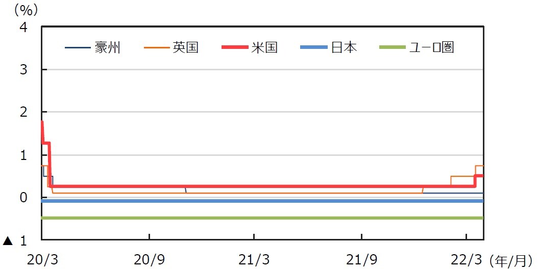 FRBは、3月のFOMCでフェデラルファンド(FF)金利の誘導目標を0~0.25%から0.25~0.50%へ引き上げ、ゼロ金利を解除しました。パウエル議長は記者会見で、「早ければ次回5月の会合」で保有資産を縮小する量的引き締め(QT)を決めると表明しました。また、FOMC参加者が示した見通しによると、2022年は0.25%を1回として計7回の利上げ予想が中央値となりました。ECBは3月の理事会で、主要政策金利を据え置く一方、量的緩和政策の縮小(テーパリング)を加速する方針を決めました。早ければ7~9月に量的緩和政策を終了します。日銀は3月の金融政策決定会合で、大規模な金融緩和策を維持しました。