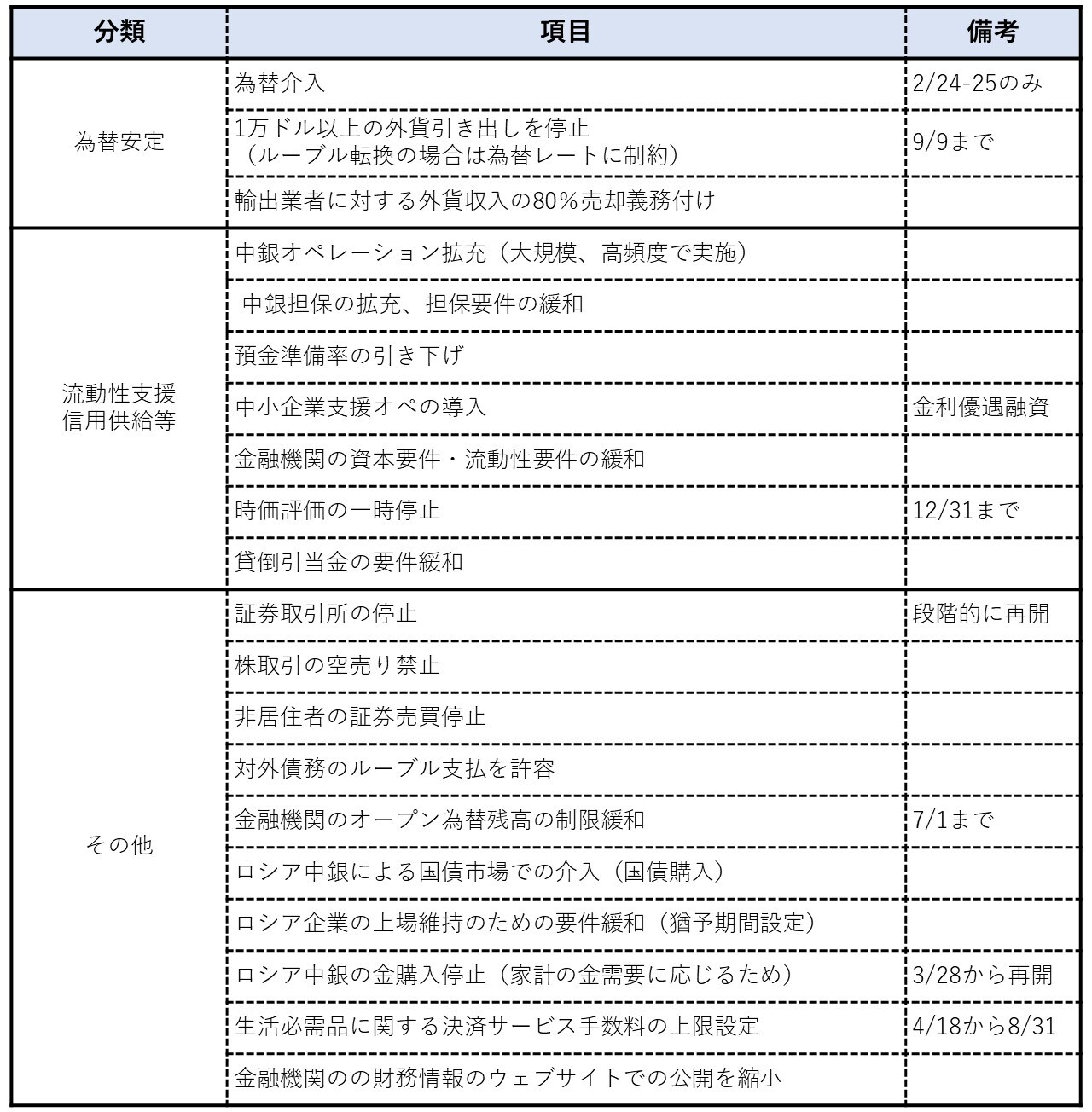 ロシア中銀の対応策は、例えば、国内での流動性支援や信用収縮を防ぐために、中銀オペレーションの拡充や担保要件の緩和、金融機関に対する資本要件の緩和や時価評価の一時凍結といった政策が挙げられる。さらに取引所を一時的に休場とすることで、金融商品の価格を乱高下させないという、やや強硬な手段も採用している。