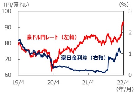 ■ウクライナ情勢は未だ不透明感が強いものの、資源価格は今後も高止まりするとの見方が多く、豪ドルには追い風です。一方で、資源価格の上昇は日本にとっては経常赤字に影響し、米国の利上げによる日米金利差の拡大から円安基調が見込まれます。豪州も利上げに舵を切れば、豪日の金利差も拡大するため、今後も豪ドル高・円安基調は続くと見込まれます。