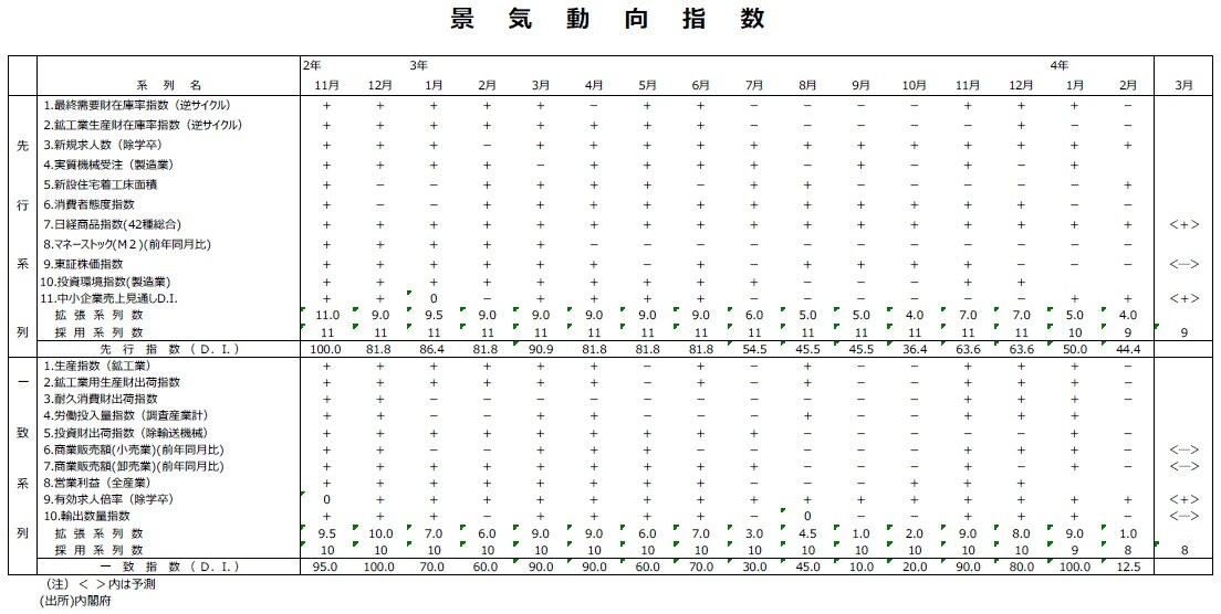 ●また、3月分の先行DIでは、数値が判明している日経商品指数、東証株価指数、中小企業売上げ見通しDIの3系列では、日経商品指数1系列がプラス符号に、東証株価指数、中小企業売上げ見通しDIの2系列がマイナス符号になることが判明している。3月分速報値段階の先行DIは11.1%以上77.8%以下になることが確定している。