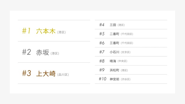 タワーマンション(以下、タワマン)、そしてなんと言っても港区の人気の高さが一目でわかる。昨年の同調査「1位 南麻布(港区)、2位 新宿区(新宿区)、3位 勝どき(中央区)」と比較しても、港区はさらに躍進した結果となった。