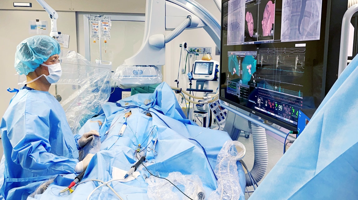 12誘導心電図やホルター心電図では、体表に電極をつけるため、心臓の内部で起きている電気の伝達経路の異常や不整脈のメカニズムまで、把握することはできません。しかしこの心臓電気生理学検査なら、不整脈中の心臓内部の電気的興奮経路を詳細に理解することができ、診断ができたら、そのまま治療も可能です。