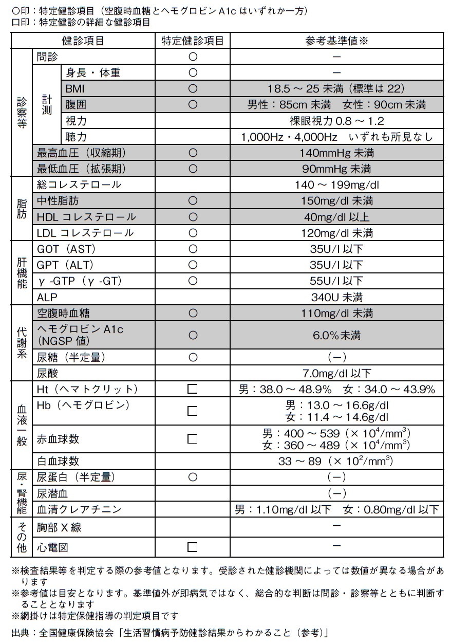 それぞれの検査項目の参考基準値は図表のとおりです(全国健康保険協会)。医療機関や健診施設により基準とする数値は多少異なっていますので、参考として見ていただければと思います。