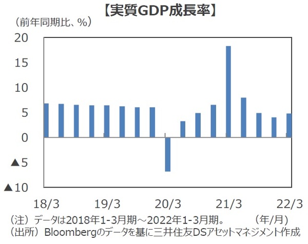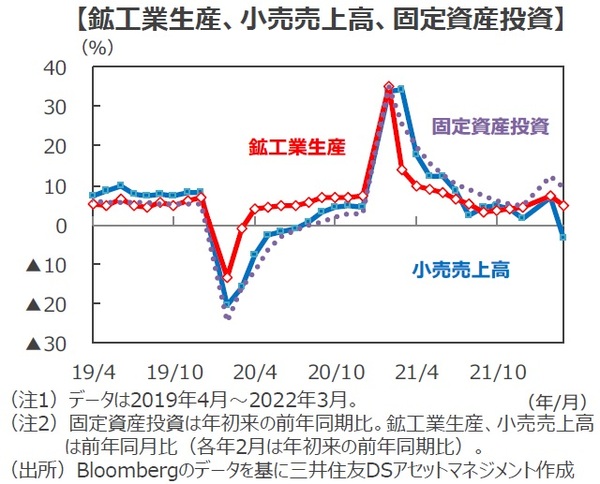 ■ただし、GDP成長率は、新型コロナウイルスの感染抑制に向けたゼロコロナ政策に伴う事実上のロックダウン(都市封鎖)の影響が十分に反映されていないとみられます。同時に発表された3月の小売売上高や鉱工業生産は足元の景気減速を示しています。