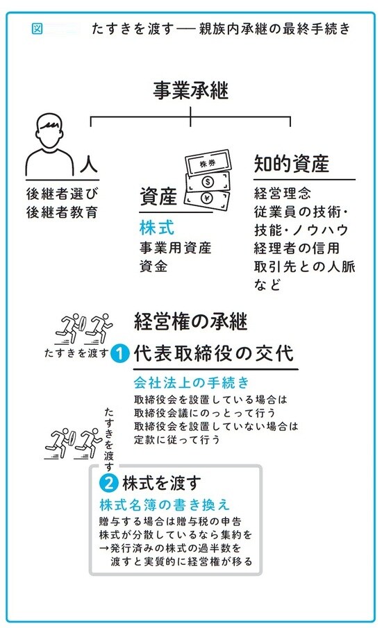 実質的には発行済み株式の過半数を渡すと、その人に実質的な経営権は移ることになりますが、株式が複数の親族に分散しているなら、これをきっかけに集約させておくのも手だと思います。
