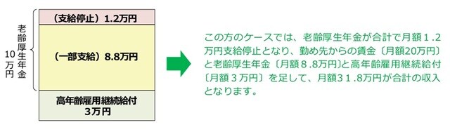 専門家:まぁ、1万2000円くらい減額されても、高年齢雇用継続給付を3万円もらえていることを考えれば、そんなに不利な制度ではないですよ。会社で稼ぐ20万円と高年齢雇用継続給付の3万円、そして減額された老齢厚生年金8万8000円を合計すると31万8000円ですから。