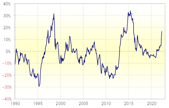 ただし、最近にかけて主要通貨に対してはほぼ米ドル全面高となっているなかで、インフレ下で悪影響が懸念される為替相場の下落が起こっているのは日本だけではありません。対米ドルでは円安だけでなく、ユーロ安、英ポンド安、豪ドル安でもあります。