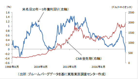 実際、足元では米実質10年債利回りのマイナス幅が急速に縮小するなかでも金価格が上昇する展開となっている点には留意が必要だろう。通常、金価格と米実質長期金利との間に逆相関(異なる方向の値動き)の傾向がみられるが、足元では順相関(同じ方向の値動き)の傾向が見受けられる。