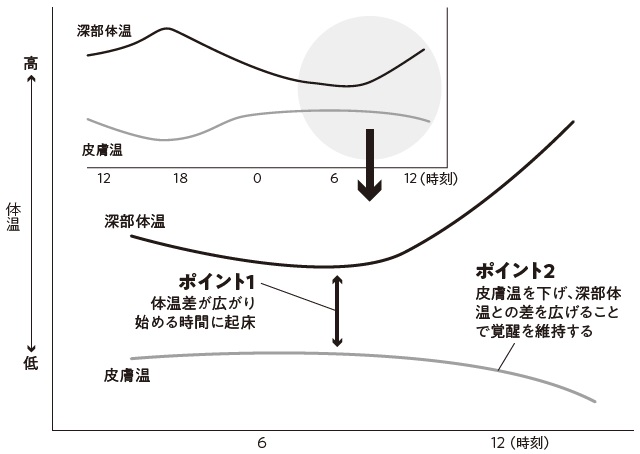 入眠も覚醒も「体温と脳」が重要です。本稿では体温を上げる目覚めの方法を紹介します。入眠時は表面血流を増やし皮膚温を上げ、熱放散増強で深部体温が下がり、「入眠スイッチ」が入り、入眠モードになります。目覚めはこの逆にすればいいのです【図表】。