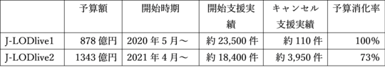 キャンセル支援としては、J-LODlive1では緊急事態等地域(2021年1月から全国ツアーも)を対象に1件あたり上限2,500万円、補助率100%で実施しました。