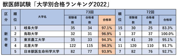 1位は岐阜大学で97.1%で、前年15位(83.3%)からの大躍進だ。2位は鳥取大学で96.9%で前年1位(100%)、3位は東京農工大学で94.3%で前年4位(95.1%)だった。以下、4位北里大学94.3%(前年11位、91.7%)、5位日本獣医生命科学大学93.9%(前年7位、92.7%)という結果だった。