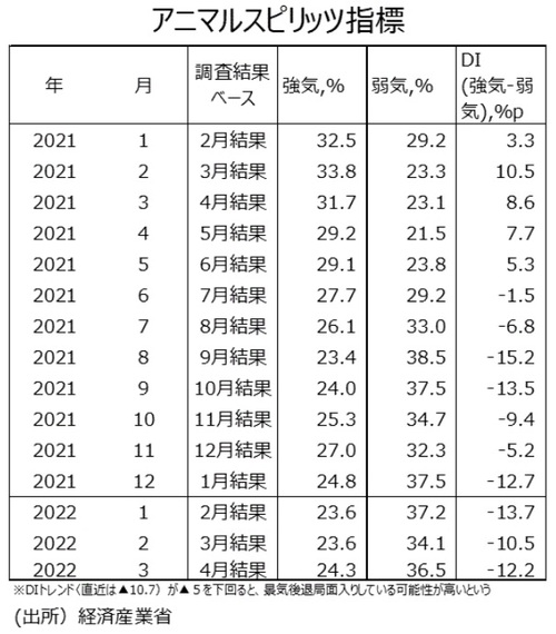 ●経済産業省は製造工業生産予測指数からアニマルスピリッツ指標を作成している。21年6月調査結果で、アニマルスピリッツ指標(生産活動マインド指標:DI)は10ヵ月連続のプラスの数値となり、企業の生産マインドは強気超の状況が続いていたが、21年7月~22年4月調査結果ではDIはマイナスになっている。22年4月調査結果のDIは▲12.2である。22年3月調査結果のDI▲10.5から悪化した。