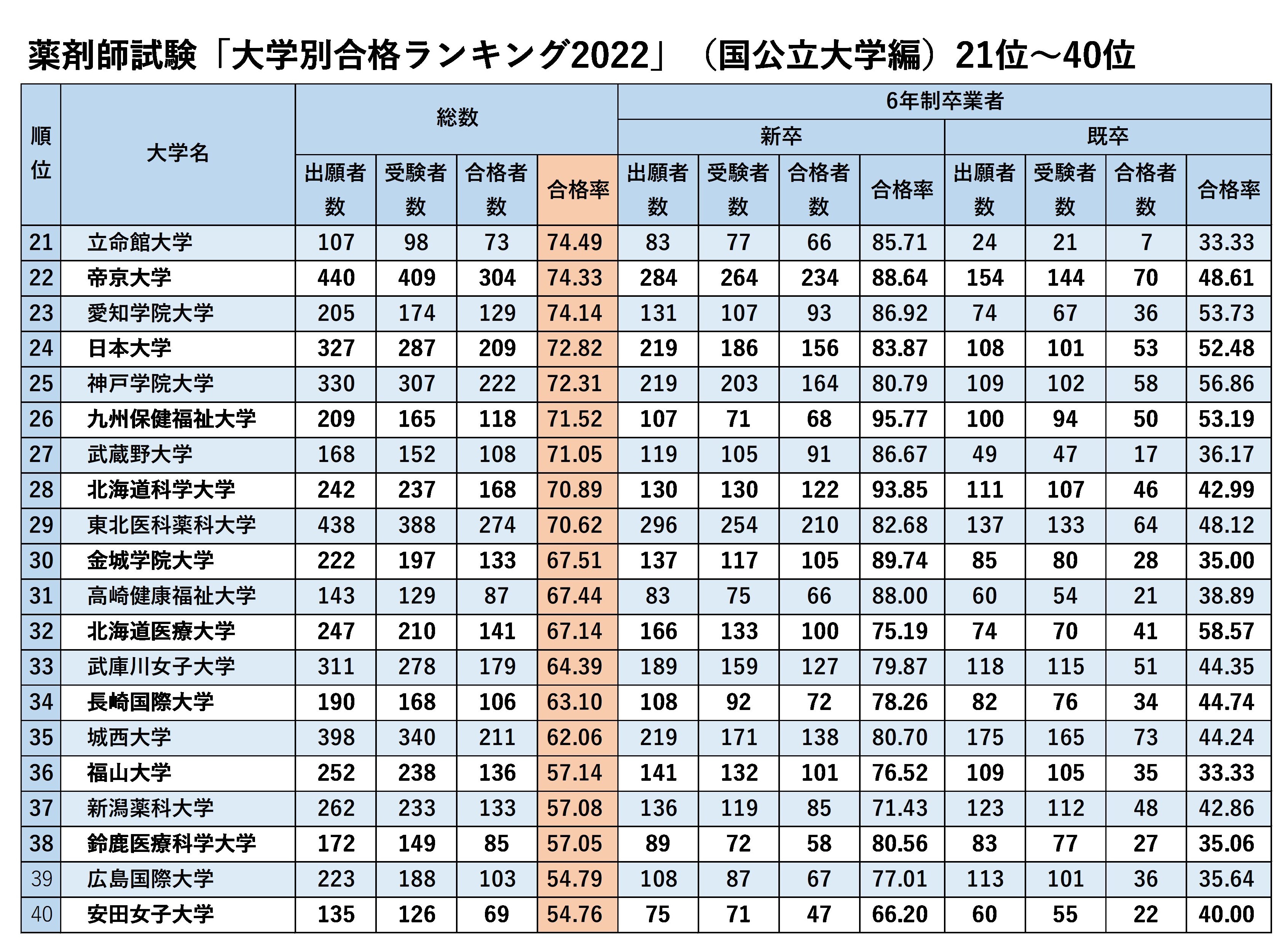次ページ薬剤師試験「大学別合格ランキング2022」私立大学編41位~56位