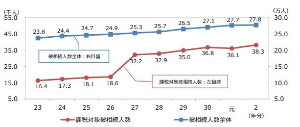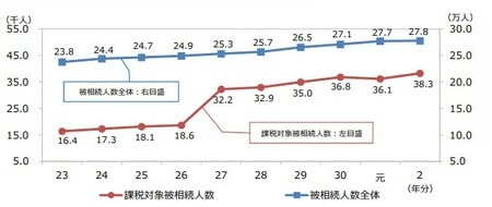 一方で、「課税対象被相続人」の数が、2014年(平成26年)を境に急上昇していることも見て取ることができます。「課税対象被相続人」とは、「被相続人」のうち、実際に相続税が課税される人のことを指します。
