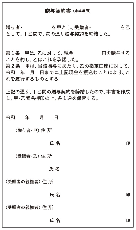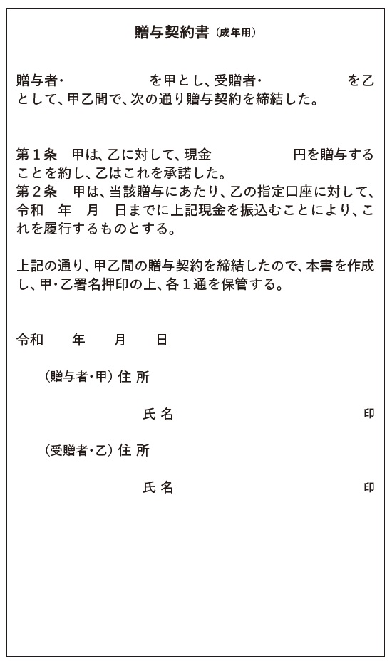 定期贈与と判断されないためには、贈与のたびに「贈与契約書」を作成しておくのが一番です。贈与するかしないか毎年意思決定を表明するためです。これはとくに決まったフォーマットはなく、ワープロソフトで印刷したものでも構いません。贈与する人と受ける人の名前を記し、金額と方法などを明記したうえで、お互いが1通ずつ保管しておきます。