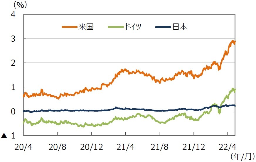 米国の10年国債利回り(長期金利)は、パウエル議長やFRB高官がインフレ抑制のため金融引き締めに一段と前向きな姿勢を示したことで、市場では予想を上回るペースで利上げを見込む向きが増え、大きく上昇しました。ドイツの長期金利は、欧州中央銀行(ECB)の金融政策正常化の前倒し観測やウクライナ危機に伴う資源高を受けて大きく上昇しました。日本の長期金利は、日銀の連続指値買いオペによりほぼ横ばいでした。