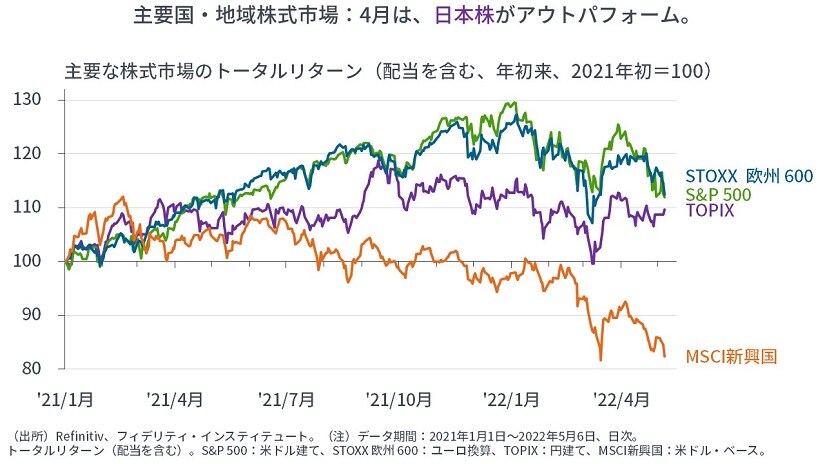 [図表12]主要な株式市場のトータルリターン(配当を含む、年初来、2021年初=100)