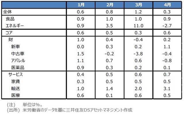 次に、前月比の上昇率を確認してみると、総合指数は0.3%と、市場予想(0.2%)を上回ったものの、3月の1.2%から大きく低下しました。一方、コア指数は0.6%と、市場予想(0.4%)を上回り、3月の0.3%から伸びが加速しました。このように、総合指数とコア指数の上昇率が、前年比、前月比とも市場予想を上回ったことから、期待されたほど、物価の落ち着きは確認されなかったということになります。