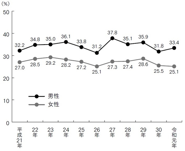 厚生労働省が発表した「令和元年国民健康・栄養調査結果の概要」によると、運動習慣のある人の割合は男性で33.4%、女性で25.1%でした(図表4)。