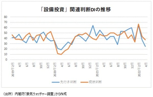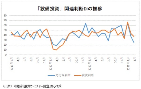 ●一方、設備投資関連・先行き判断DIは21年10月52.8(回答した景気ウォッチャー・9人)、11月57.1(同7人)、12月60.0(同5人)と4ヵ月連続の50超になった。その後、22年1月37.5(同8人)、2月は66.7(同3人)、3月は37.5(同6人)、4月25.0(同2人)と推移している。3月では「円安下での原油、原材料価格の高騰、輸入品を中心とした物流の混乱により、スタグフレーションが更に進行する懸念が強い。業務上不可欠な資材に調達の遅れがみられ、必要性が高い設備投資にも着工の遅れが出ている。資材の先行調達や要員確保など、BCPを強く意識した運営が必要である。(南関東・ゴルフ場〔経理担当〕)」というコメントがあった。