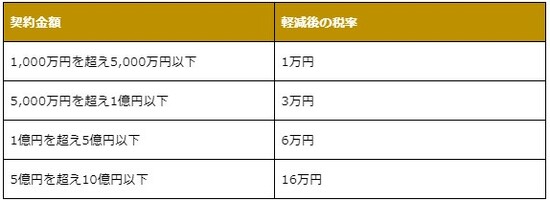 ただし、2022年4月1日~2024年3月31日に作成する「不動産譲渡契約書」のうち、契約金額が10万円を超えるものおよび「建設工事請負契約書」のうち、契約金額が100万円を超えるものには、下記の軽減措置が適用されます。