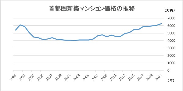 実際に、2021年度(21年4月~22年3月)の首都圏(1都3県)の新築マンション1戸当たりの平均価格は6360万円(前年度比6.1%増)でした。実はこの数字はバブル期の1990年度に記録した6214万円を上回り、過去最高を更新しました。