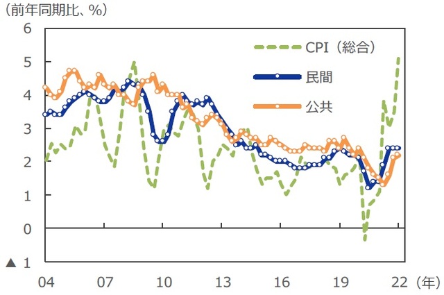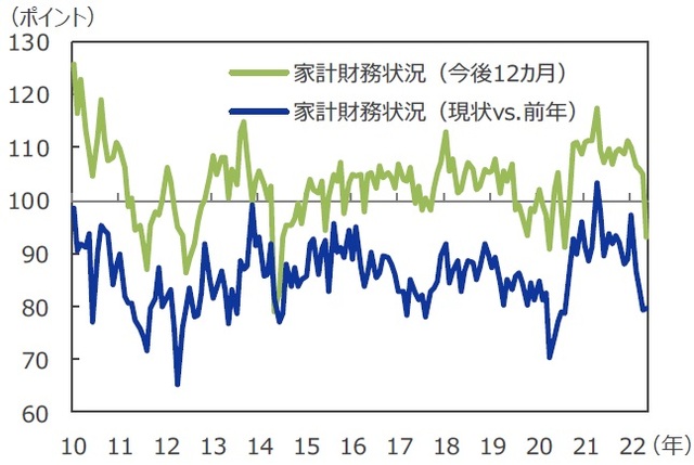 ■2022年1-3月のCPIは前年同期比+5.1%と2001年4-6月以来20年9ヵ月ぶりの高水準です。対して賃金上昇率は、民間部門が同+2.4%、公共部門が同+2.2%にとどまっています。さらに家計の財務状況を確認すると、急激に悪化しています。