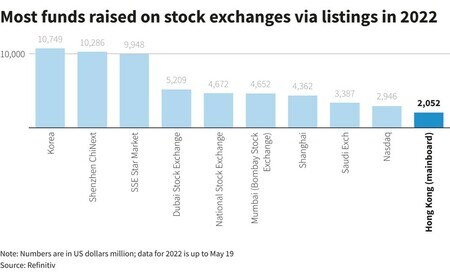 香港取引所で今年に入ってIPOで資金調達された金額は、昨年同期間の207億ドルに対して21億ドルに過ぎず、2009年以来の過去12年間で最低を記録した。前年比では90%減少という厳しい状況である。