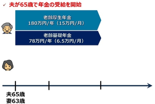 先生:そうだね。ところで、年金の受給は65歳がスタートなんだ。夫が65歳になると、年金がもらえるようになるけど、ここで取り上げたケースは、妻が2歳年下の63歳だから、まずは夫1人の年金で夫婦の生活をまかなわなければならない。