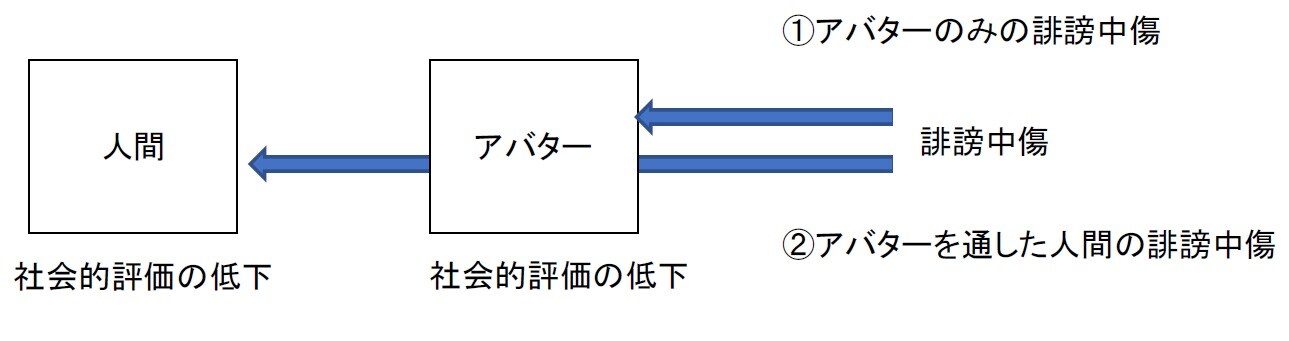 アバターに対する誹謗中傷が、その背後にいるユーザという人の社会的評価を低下させるのであれば、名誉毀損の成立することは明らかですが、アバターのみの社会的評価を下げ、その背後の人の社会的評価を下げないような場合には、人の人格権を侵害しない以上、名誉毀損は成立しないという考え方もあり得ます。