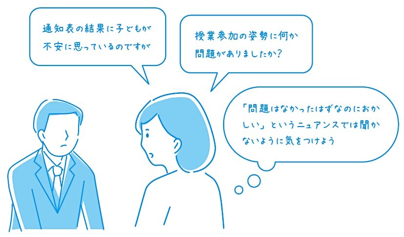 「主体的」が真ん中評価になっている科目が目立つ場合は、一度連絡帳を使って先生にアポイントを取り、相談する機会をいただけないか聞いてみましょう。報告書をちらつかせることは一切せず、「通知表の結果について子どもが不安に思っている」と伝えた上で、授業参加の姿勢に何か問題がなかったかどうかを確認します。このとき、「問題はなかったはずなのにおかしい」というニュアンスでは聞かないように気をつけてください。